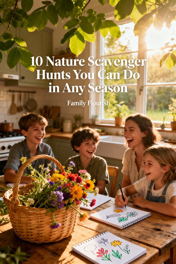 You've revealed nature's treasure chest—one that never closes, regardless of the season outside your door. These scavenger hunts change every outdoor space into a living classroom, where observation sharpens like a hawk's vision and curiosity blooms perennially. As you explore, you're not just collecting memories; you're cultivating environmental stewardship. Each discovery plants seeds of conservation in young minds. So grab your list, step outside, and let nature's endless lessons unfold beneath your feet, rain or shine.