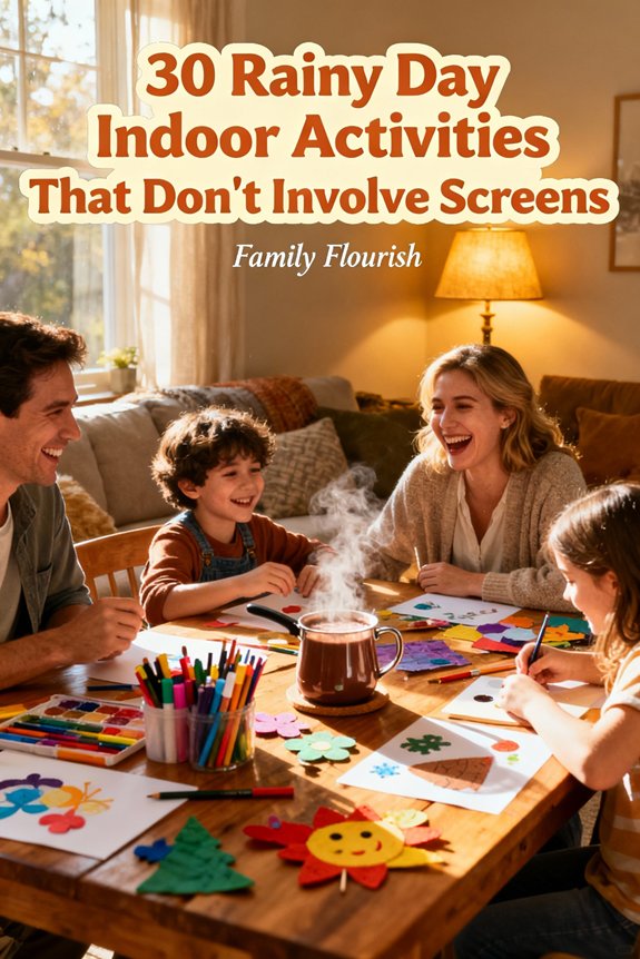 You'll find endless possibilities for screen-free fun on rainy days. Convert your living room into an adventure zone with blanket forts, obstacle courses, and indoor camping setups. Get creative with art galleries, friendship bracelets, and slime-making sessions. Host dance parties, treasure hunts, and fashion shows that'll have everyone laughing together. Don't forget classic board games, science experiments, and paper airplane competitions that spark imagination. These simple activities use everyday household items to create memories that last far beyond the rainy afternoon, and there's so much more you can discover to keep your family entertained.